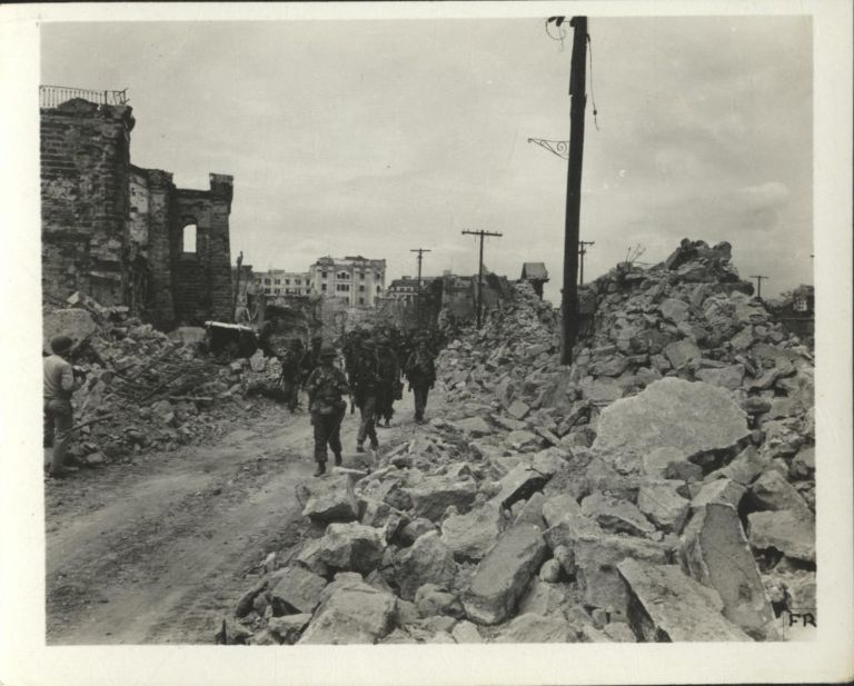 Subject: Street fighting in Manila during the battle for liberation in February, 1945. This is the view in Intramuros as U.S. soldiers advance to secure the area. The rubble on the right is a breached