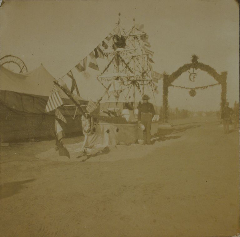 Subject: A U.S. soldier poses next to a model warship, likely Admiral Dewey's flagship "Olympia," at a military camp festooned with decorations as if for a celebration.