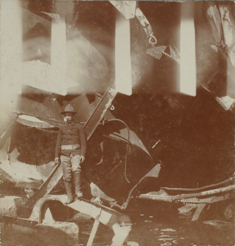 [Untitled - U.S. soldier standing on wreckage of a sunken Spanish warship?].