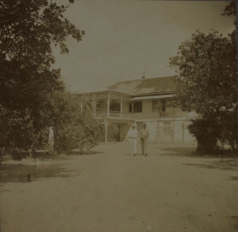 Subject: Two Americans pose outside a large building which is identified in OFI-002285 as being the headquarters building in Paco, Manila.