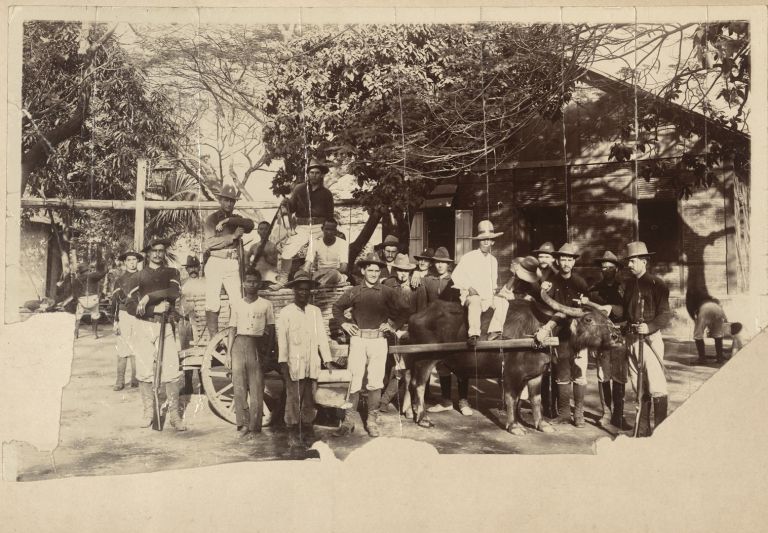 [Untitled - U.S. soldiers pose with Filipinos, carabao, and cart].