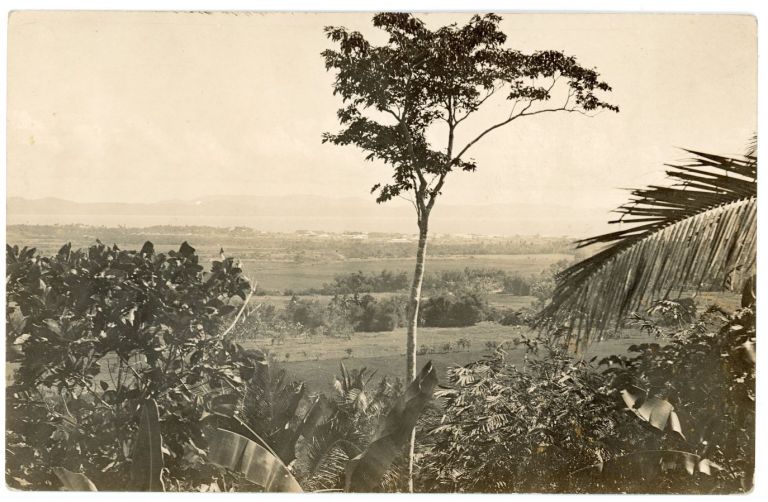 View from a hill of tree, foliage, farmland and buildings near shore of a Philippine lake or strait.