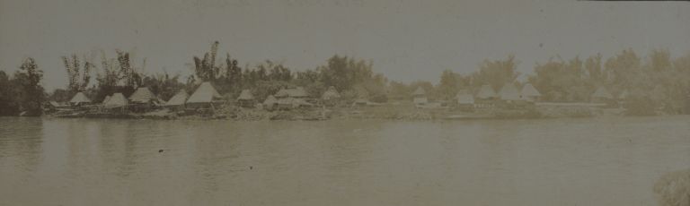 Subject: A village full of nipa huts line the banks of a large Philippine river.