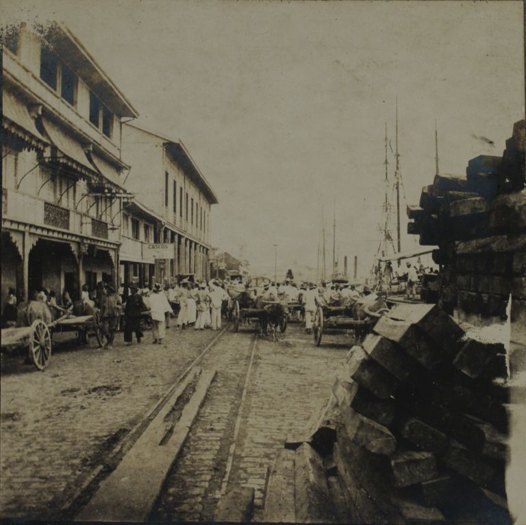 Subject: Busy commercial street on a waterfront, with carts and wagons moving cargo to and from ships moored at the wharf. Probably along the Pasig River in Manila. A sign offers cascos (lo