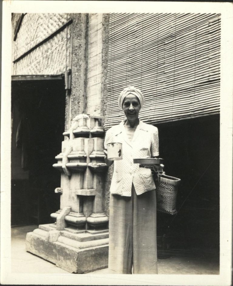 Subject: A freed detainee woman stands outside the Main Building at Santo Tomas Internment Camp in Manila. The camp was the largest of several camps in the Philippines in which the Japanese interned