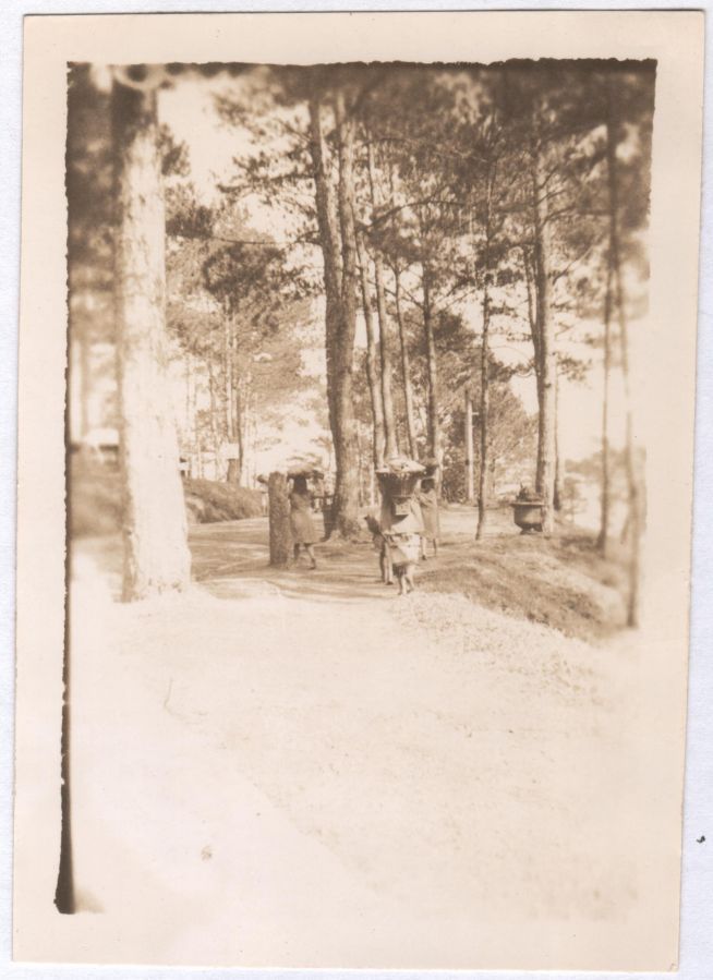 Typically photos like this specify that the individuals are indigenous, but this is too unfocused to see if they are Igorot. Women walking on a path carrying head baskets in Baguio. Images in this album are from an American soldier in the U.S. Army 13th Air Force stationed at Clark Field.