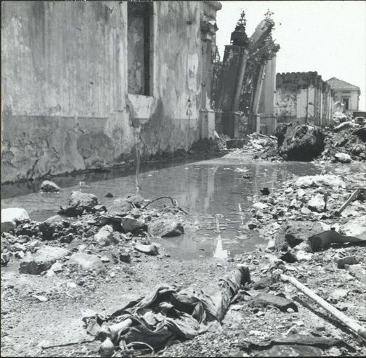 Subject: Rubble and destruction caused by the Battle for Manila, February 1945. The building is likely a church in Intramuros.