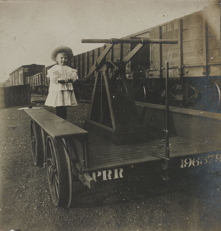 Subject: Child on a handcar of the Pennsylvania Rairoad. A handcar or pump car is a railroad car powered by its passengers pumping the handles up and down. It is mostly used as for maintena