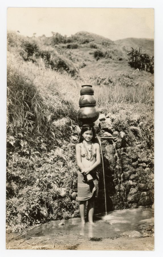 Young Igorot woman with a big smile stands next to a spring, carrying three water jugs on her head.