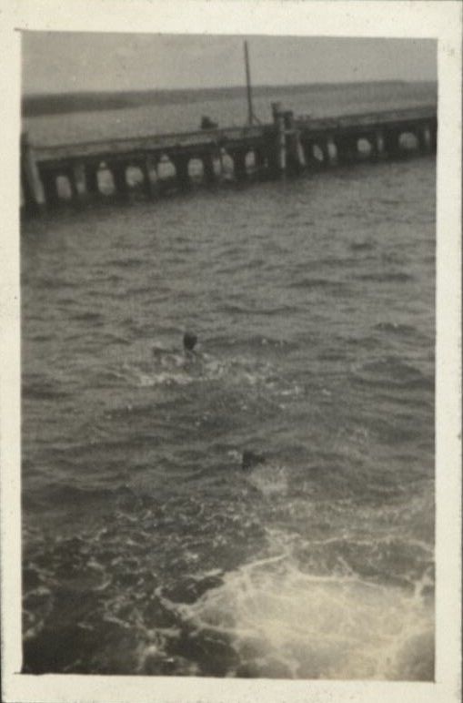 Subject: Children, dependents of American servicemen, diving and swimming by a pier. Probably at Subic Bay.