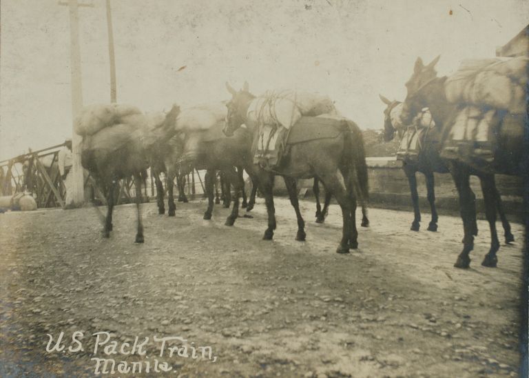 Subject: Horses (or possibly mules)loaded with equipment provided much of the transportation for U.S. soldiers' equipment in the Philippine-American War. See also ROJR-001123.
