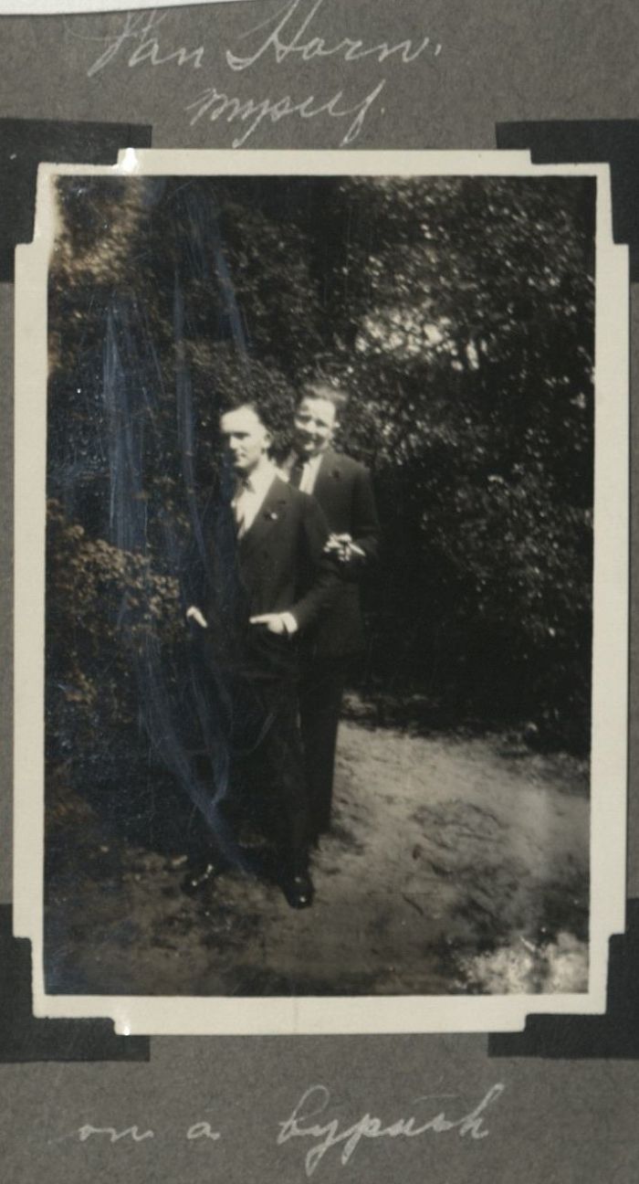 Subject: Lester Brundege (left) and an airman buddy in formal dress pose outdoors, probably in Mehan Botanical Gardens.