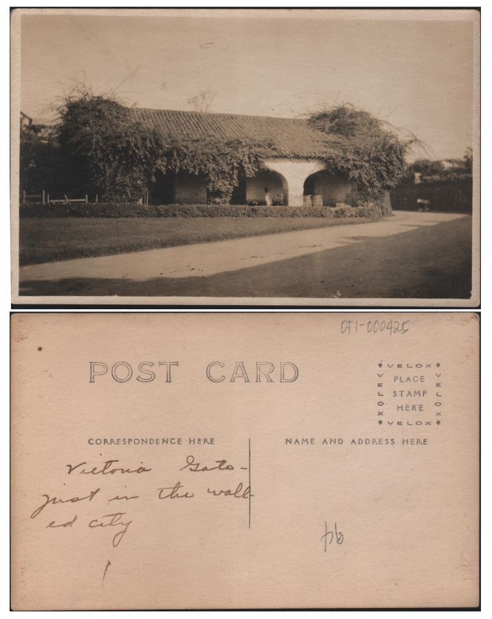 There is no "Victoria Gate" as per the handwritten caption on back, but Victoria Street in Intramuros runs by Manila High School.