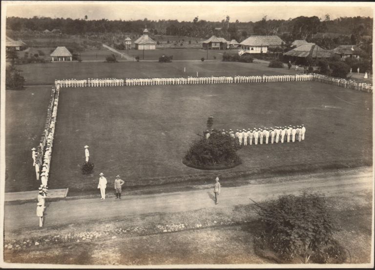 View of the parade grounds [at Iwahig Prison] with prisoners lined up for inspection.
