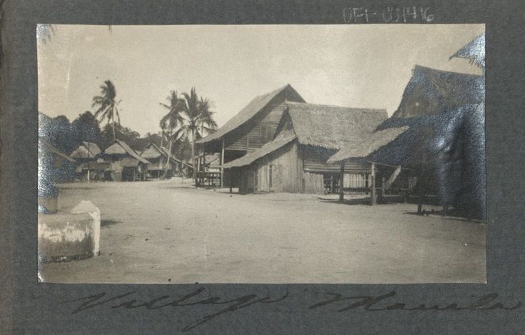 Subject: View down street though a neat, clean Philippine village in the vacinity of Manila with typical thatched roofs.