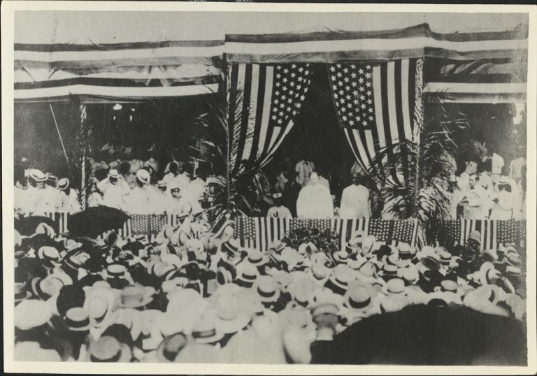 Subject: William Howard Taft addresses a gathering amid drapery of U.S. flags. Taft was a monumental figure in shaping U.S. policy and administration of the Philippines in the early 1900s. A good brie