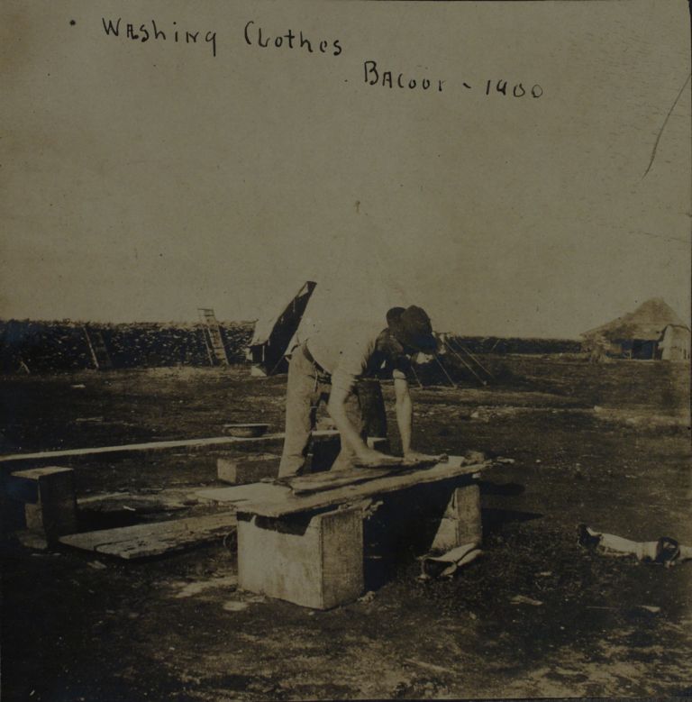Subject: Of the hundreds of laundry photos in the OFI collection, this may be the sole image of a man washing clothes. A U.S. soldier appears to be scrubbing a pair of pants on a wide board