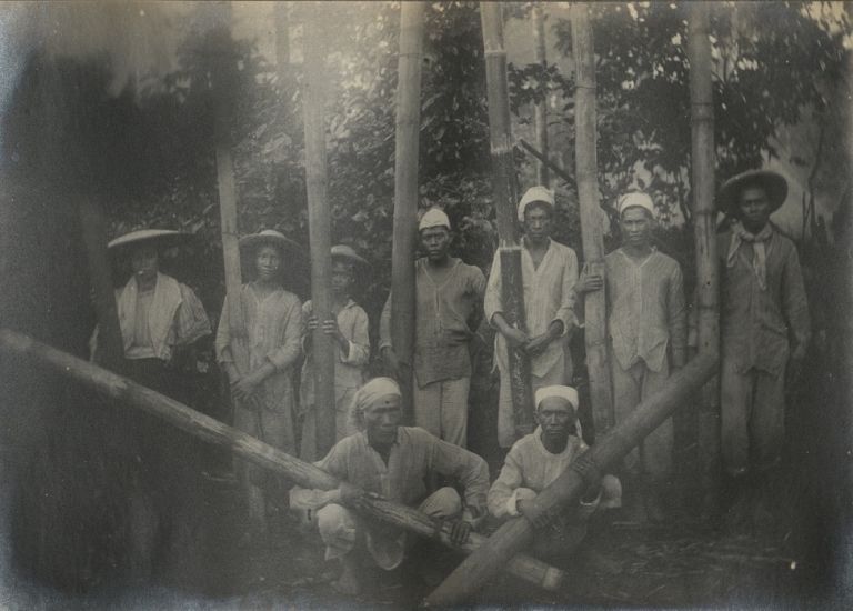 Subject: Filipinos in Batangas Province pose for a group photo with long, hollow bamboo tubes used to transport water.