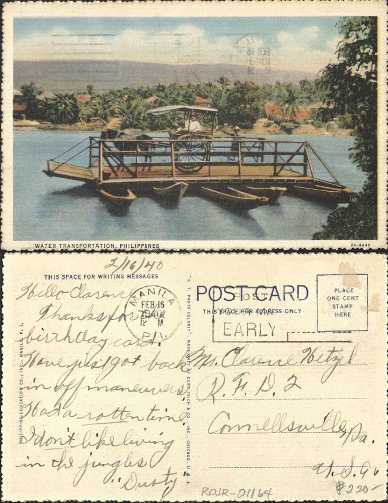 Subject: Calesa and horse on unusual makeshift ferry � barge placed sideways across 5 bancas which serve as pontoons.
