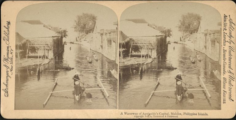 Underwood #U375. View from bridge of men paddling outrigger canoe on canal in Malolos, Philippines.