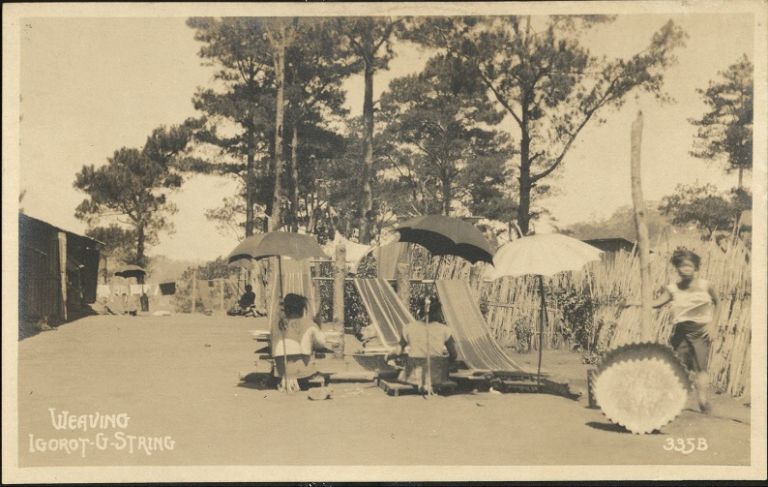 Subject: Igrot women weaving under shade from umbrellas; pine trees in background.