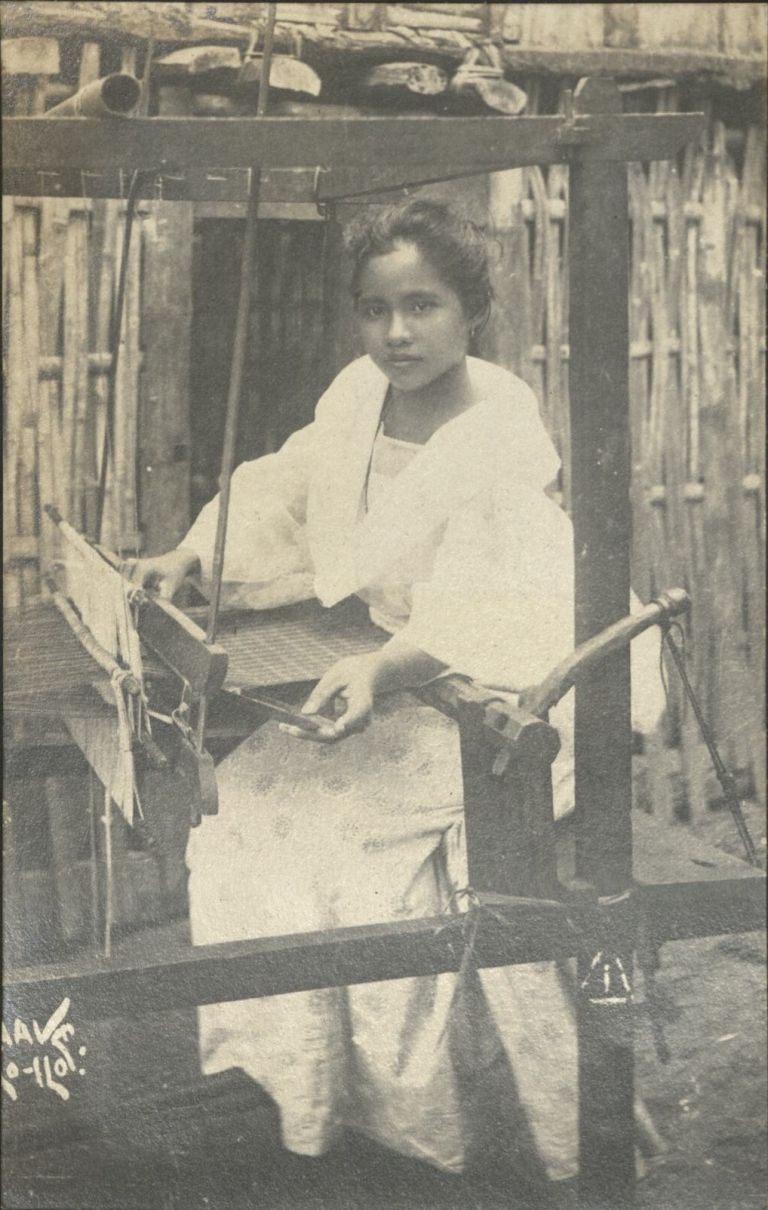 Subject: A Visayan woman in Iloilo sits at a loom wearing elaborate traditional dress, weaving cloth. A commercial photo printed on postcard stock.