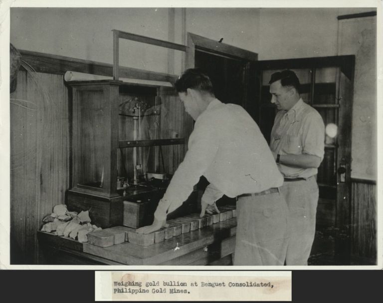 Two Americans weigh and inspect gold bars (ingots) in the office of Benguet Consolidated Mining Co., which changed its name to Benguet Consolidated, Inc. in 1956 and is today known simply as Be, which is likely a shortened version of Benguet Corporation.