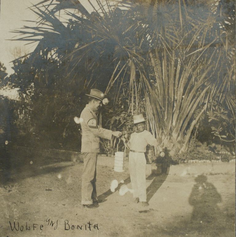Subject: A U.S. Army non-commissioned officer buys milk or some other liquid from a Filipino boy carrying his goods on a shoulder pole.