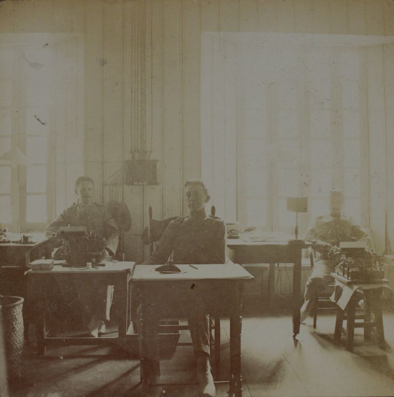 Subject: Clerks or other office staff at a military headquarters sit at their small desks during the Philippine-American War. At least history has recorded their last names. See also OFI-00
