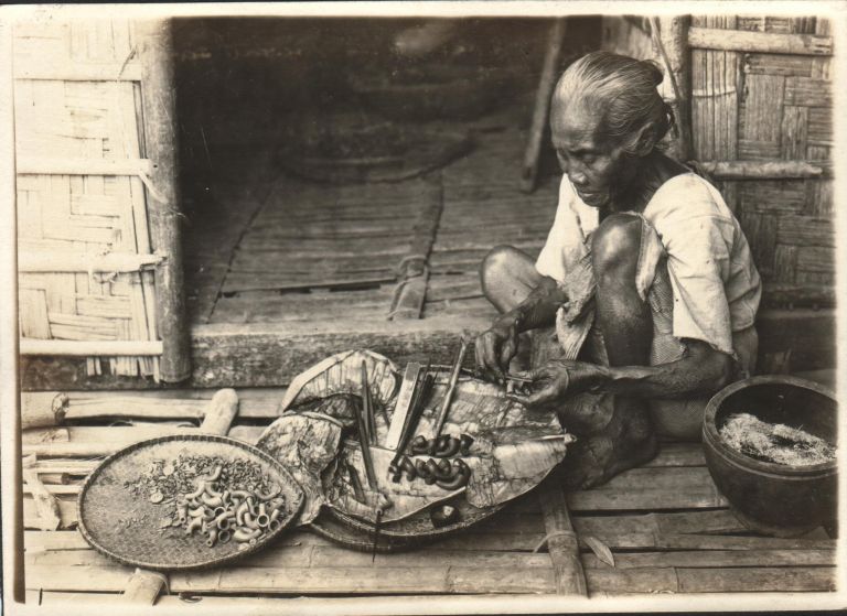 Subject: An older Filipina constructs smoking pipes - perhaps from clay - at the entrance to her home.