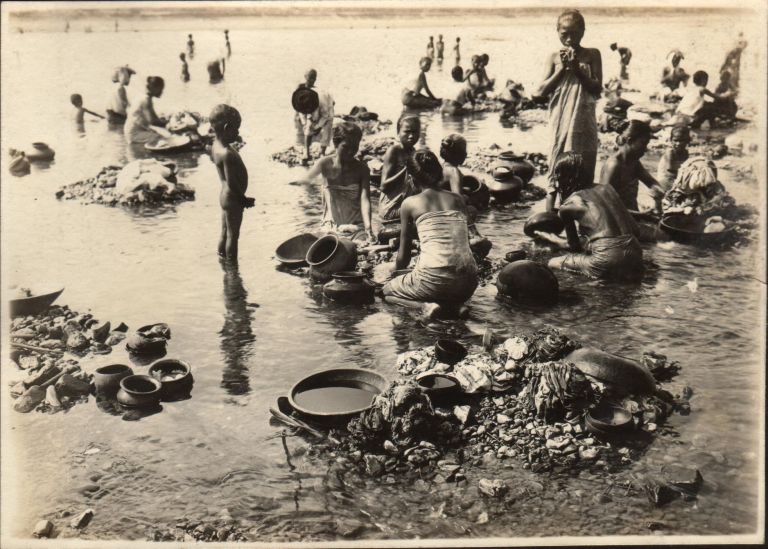 Subject: By process of elimination this caption should match this photo, although the women appear to be washing laundry and the children are bathing in the river, rather than getting water - although