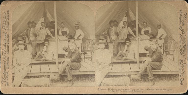Underwood #U1325. Wounded Filipino soldier receiving medical attention in tent of U.S. military hospital, Manila, Philippines.