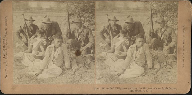 Kilburn #B13404. Three U.S. soldiers watch over two wounded and captured Filipino soldiers in Malabon, near Manila, Philippines.