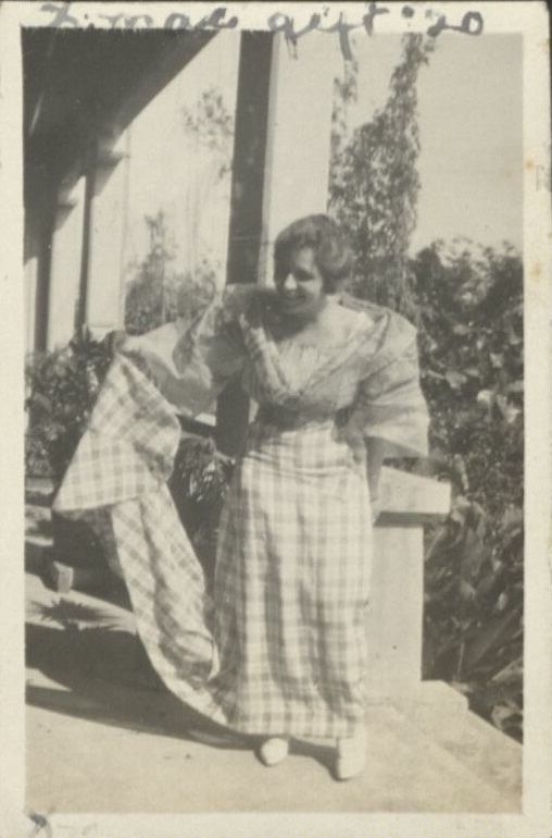 Subject: American woman models her Christmas gift - a terno, or formal Philippine dress. This woman (whatever her name may be) is most likely the creator of this album. See also OFI-004612.