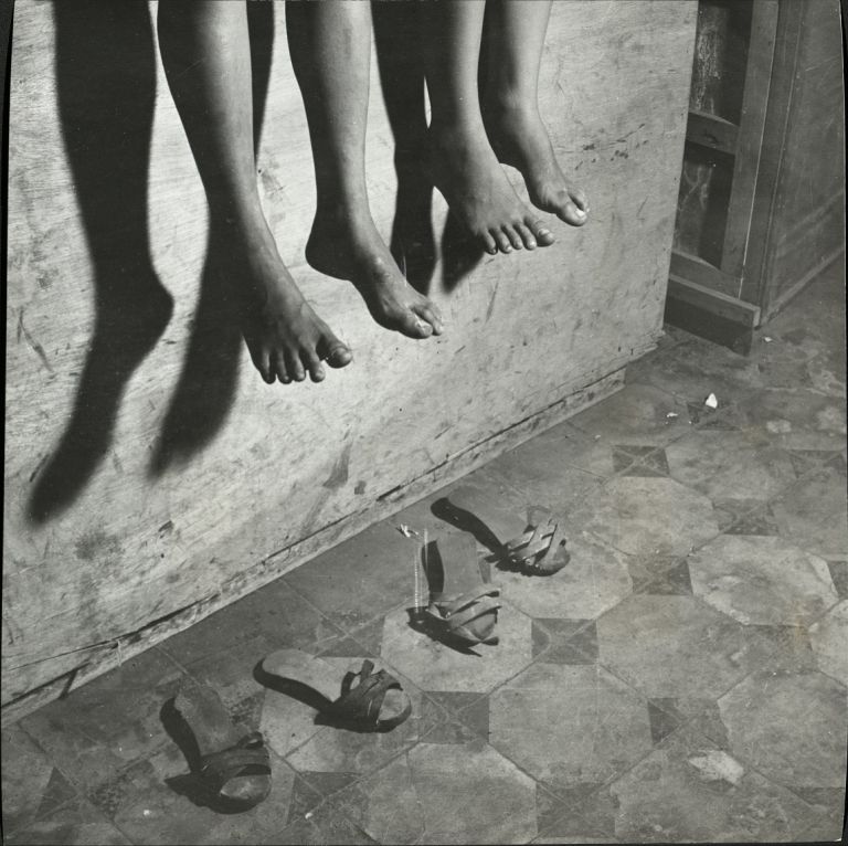 Subject: Two Filipino children sit and dangle their legs on (possibly) a wooden crate, with their sandals on the floor below them.