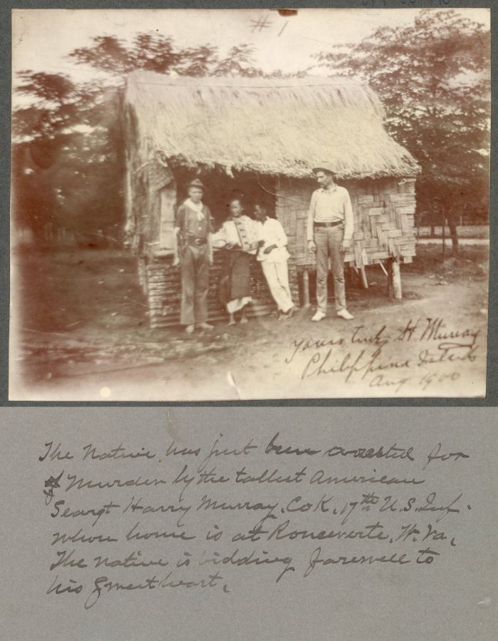 Two U.S. soldiers stand next to a Filipino couple in front of their simple house. Caption on back reads: "The native has just been arrested for murder by the tallest American, Sergeant Harry Murray. Co. K 17th U.S. Infantry whose whom is at Ronceverte, W. Va. The native is bidding farewell to his warmheart.