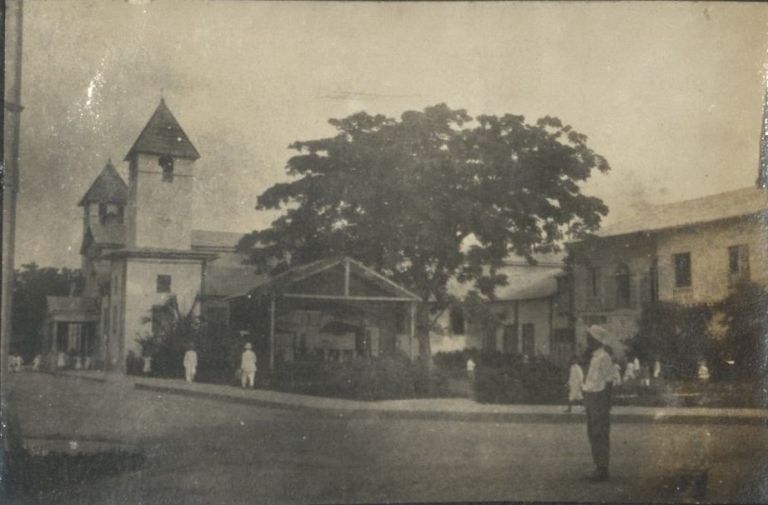 Subject: The old Zamboanga Cathedral, located across from Plaza Pershing, was made of wood and concrete. It was destroyed by bombs in World War II. A traffic cop stands in the intersection.
