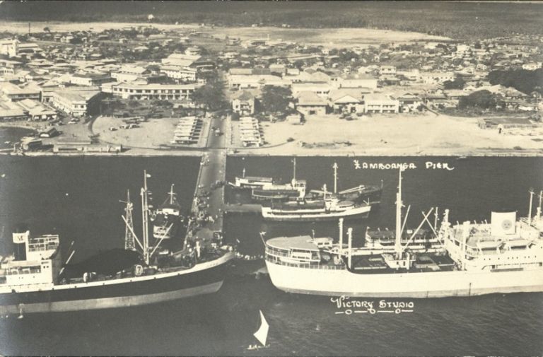Subject: Aerial view of Zamboanga City shoreline, cargo vessels at pier, with city in background.