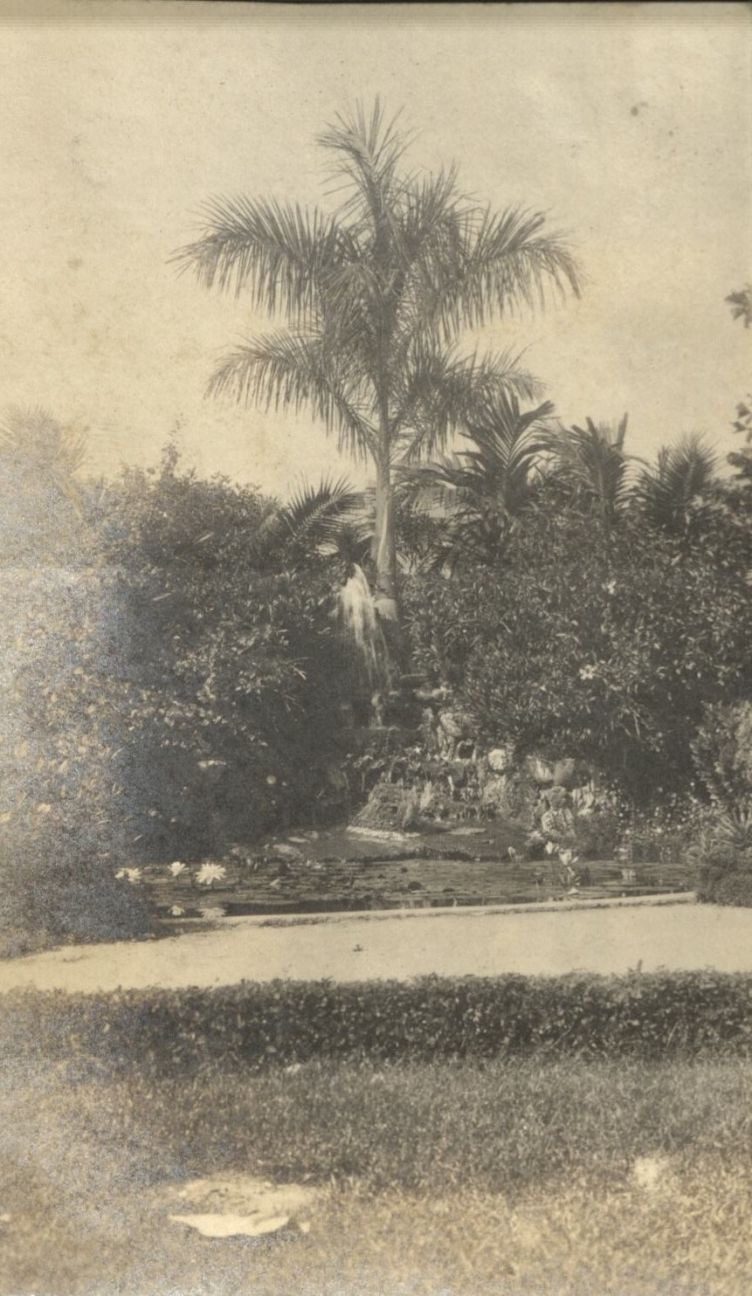 Subject: Palm tree and landscaped garden surrounded by a pond with water lilies, possibly at San Ramon in Zamboanga City. San Ramon Prison and Penal Farm was established in southern Zamboan