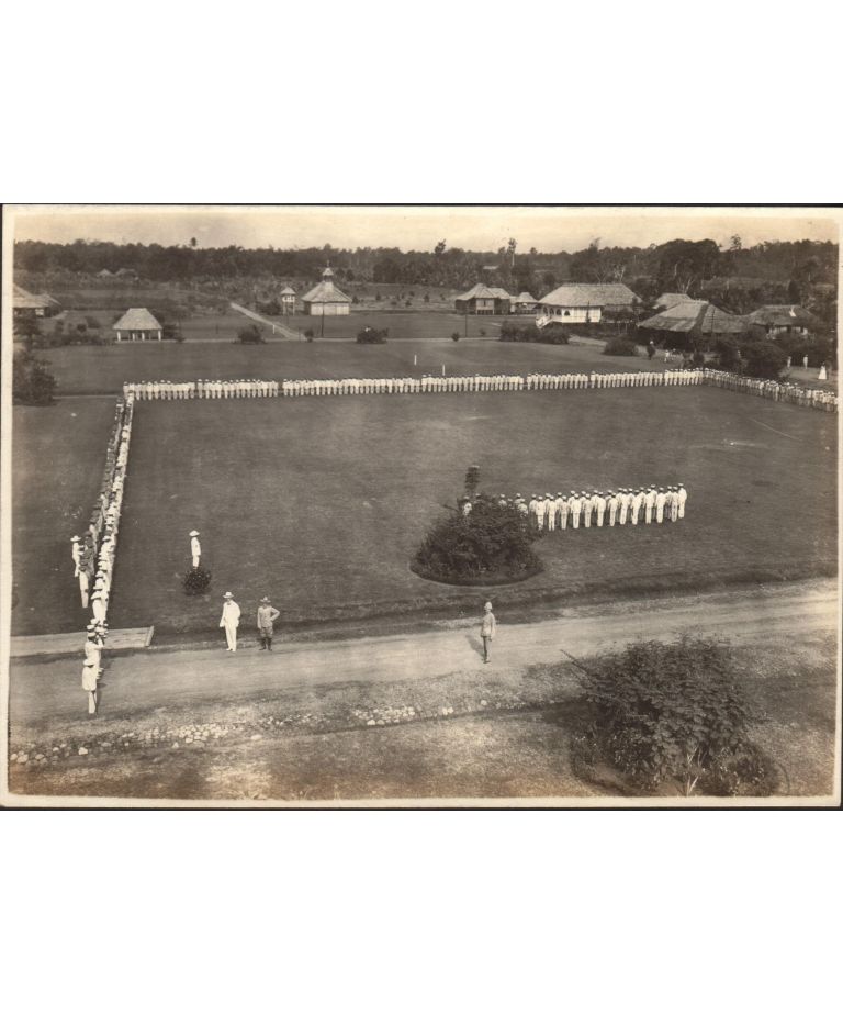 View of the parade grounds [at Iwahig Prison] with prisoners lined up for inspection.