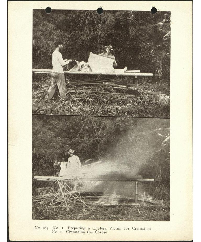 No. 264. No. 1. Preparing a cholera victim for cremation. No. 2. Cremating the corpse.