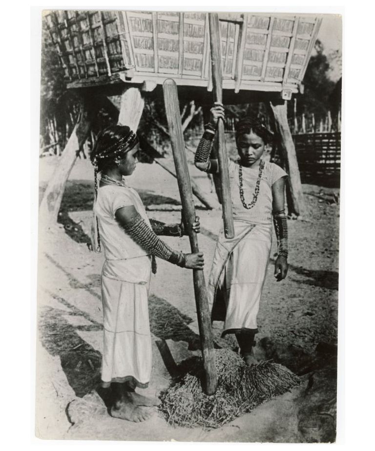 Two young Filipino girls pounding rice. (...)