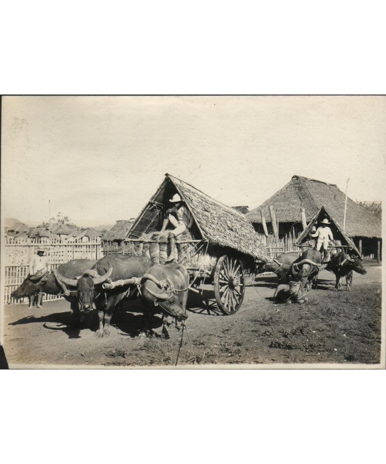 Two carts hauled by three carabao each, transporting hemp to the market. Tabaco, Albay Province.