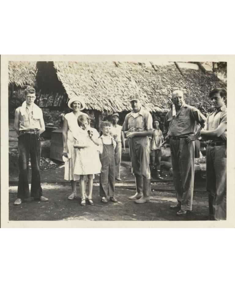 Myself [Harry Hawkins, Jr.], Mrs. Shaw, Loraine, Walter, Mr. Seleeby [?], Capt. Shaw and Jim [Stapler] at the entrance to the coal mine.