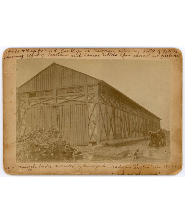Manila & Dagupan R.R. car shops at Caloocan after the battle of Feb. 10 [1899] showing effect of Montana and Kansas bullets. Gun shown in picture is a muzzle loader mounted by Insurgents. Made in "Trubia" in 1857.