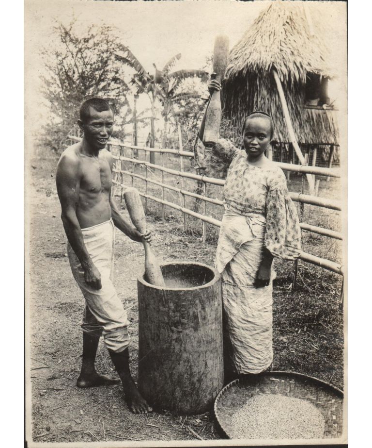 Man and woman pounding rice with pestles in a wooden mortar to loosen hull. Bigao [Bigaa, now Balagtas], Bulacan Province.