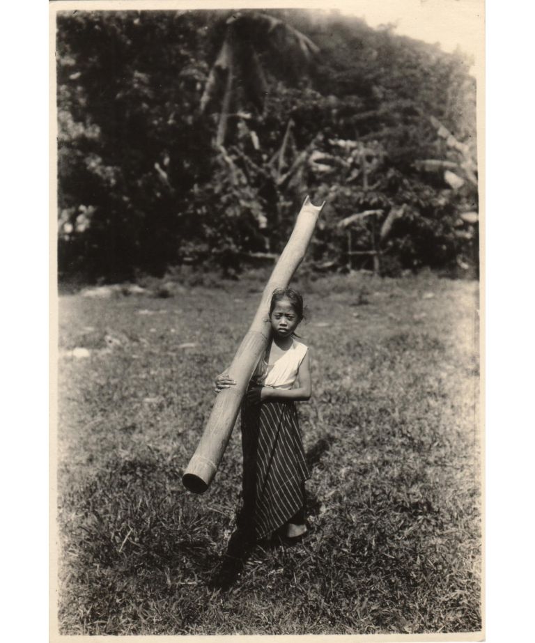 Little Visayan girl carrying water with a bamboo, Jaro, Iloilo.
