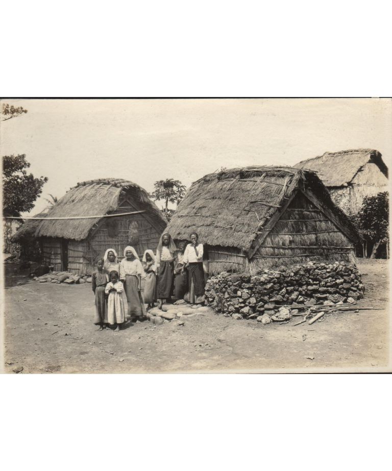 Group of native women and cogon grass houses. Santo Domingo de Basco, Batanes Islands.