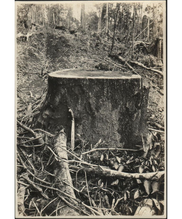Good stump height. Palosapis [Shorea palosapis, also called Philippine Mahogany or White Lauan] stump 1 meter 46 centimeters diameter, stump height less than 1 meter, Limay, Bataan.