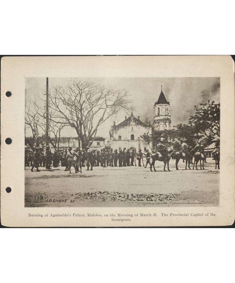 Burning of Aguinaldo's Palace, Malolos, on the morning of March 31 (1899). The Provincial capitol of the Insurgents.